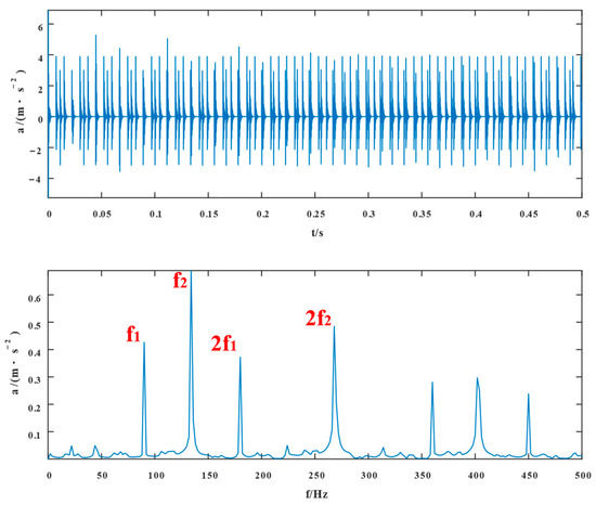 Figure 2 depicts the time-domain diagrams and envelope spectrums of composite fault signals in the inner and outer rings of a bearing without noise, respectively. In Figure 2, the simulated signal shows evidence of a periodic shock component. The envelope spectrum indicates that the inner and outer ring fault frequencies and their multiplication frequencies were included in the simulated signal.