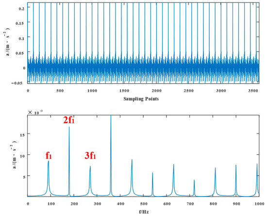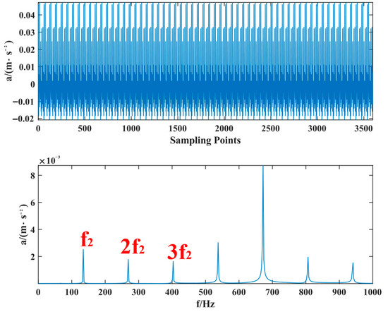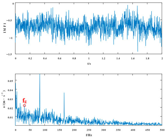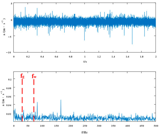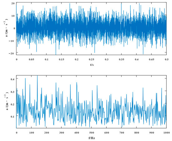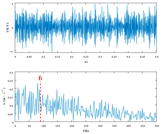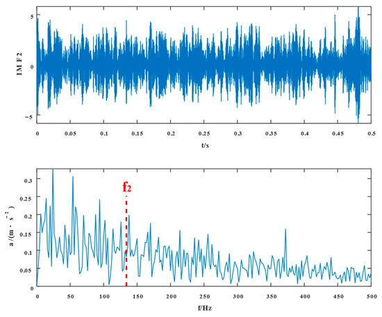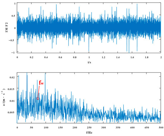 Figure 15 displays the fault signal’s time domain structure and envelope spectrum, in which the sampling frequency was 1.5–3.5 s. The time domain diagram shows the existence of shocks, indicating the existence of bearing faults. We cannot accurately extract the characteristic frequency in the fault signal from the envelope spectrum of outer ring and rolling body fault frequencies because it is difficult to see the type of fault frequency from the envelope spectrum alone.
