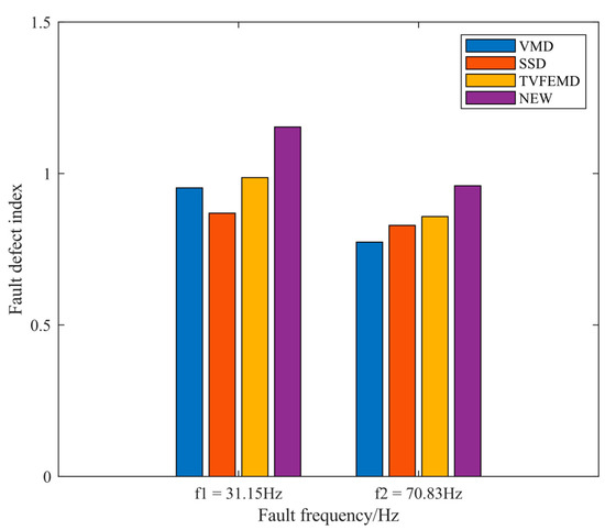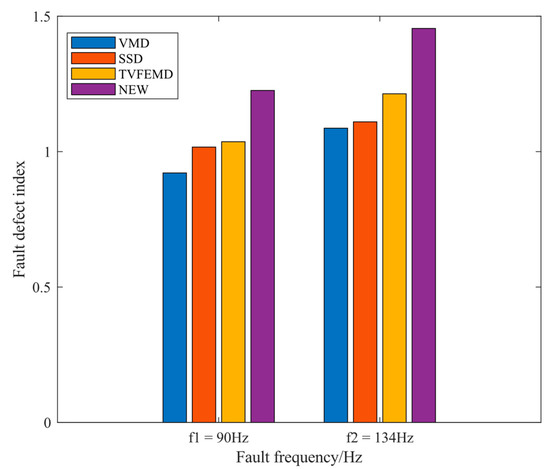 where is the fault defect index at the corresponding frequency, is the envelope spectrum amplitude of the relevant frequency, and denotes the fault frequency. Considering the error in the actual calculation of the fault frequency of rolling bearings, the mean value of was chosen as the envelope spectrum amplitude at the fault frequency . represents the mean value of the fault defect index, which is obtained by finding the mean value of the fault defect index at 1–3 times the frequency of the fault. The proposed novel method can be examined to better emphasize the frequency of fault features in light of the fault defect index result in Figure 12, which shows this.