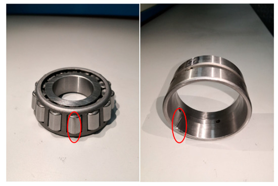 Bearing compound fault setting ((left): rolling element fault; (right): outer ring fault).