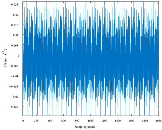 Using the method proposed in this paper, we demonstrated the validity of the method for detecting rolling bearing faults under strong noise and compound fault conditions. We established a simulation signal under faults affecting the inner and outer rings of rolling bearings, and the expression is shown in Equation (22), where and represent the vibration signal under the fault of the outer ring and inner ring of the rolling bearing, respectively; represents the noise, taking the signal-to-noise ratio equal to ; and represent the resonant frequency, and , where the outer ring fault frequency is set to , and the inner ring fault frequency is set to ; represents the amplitude, ; and represents the damping coefficient, ; sampling frequency: , sampling points: .