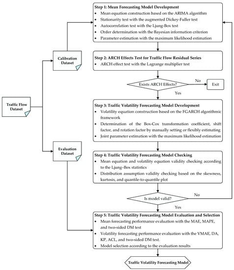 Generally, the framework can be systematically deconstructed into five steps. First, a mean forecasting model is built based on a calibration dataset and the ARIMA algorithm. To achieve satisfactory mean forecasts, the stationarity test and autocorrelation test are conducted using the augmented Dickey–Fuller (ADF) test [] and the Ljung–Box test [], respectively, and the orders of the ARIMA model are optimally identified with a step-wise algorithm [] based on the Bayesian information criterion (BIC) []. Second, conditional heteroscedasticity, also known as the ARCH effect, is checked for the residual series obtained according to the mean equation. To achieve this purpose, the Lagrange multiplier test [] is carried out. Third, if the ARCH effects are statistically significant, multiple traffic volatility models based on the FGARCH algorithmic framework are established to capture the symmetric or asymmetric effects in traffic volatility, while a joint estimation of the mean and volatility equations is performed to determine the model parameters using the maximum likelihood estimation (MLE) [] method. Fourth, the developed models are checked to ensure the validity of the mean equation, volatility equation, as well as the distribution assumption. Finally, the traffic volatility forecasting models are evaluated in terms of performance measures of both mean forecasting and volatility forecasting, and the best model is selected for different application scenarios. In what follows, each step of the proposed framework is described in more details.