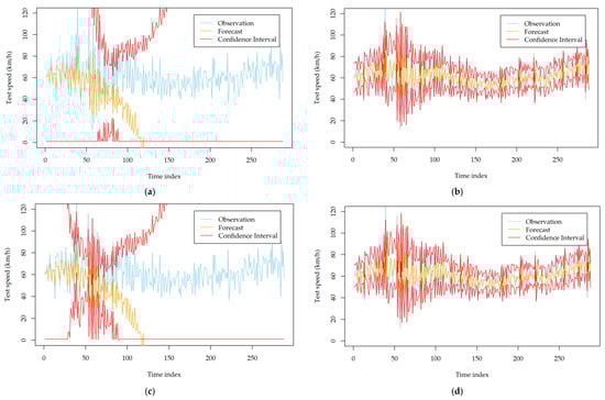 To investigate the impact of the two order identification strategies on the forecasting performance of the developed models, we recorded the forecasting results using the two strategies. After careful inspection and calibration, we found that the two strategies lead to similar forecasting performance for most stations. However, for several specific monitoring stations, they show significant differences. Appendix A Table A3 and Table A4 show the comparison results on such kinds of stations. From the tables, we can see that the models established based on the automatic strategy can result in a significantly poor mean forecasting performance and volatility forecasting performance. The MAE and DA deteriorate dramatically for all of the developed models. This observation can be further obtained with Figure 3, which describes the forecasting results of the developed models at station MA_1014014 on 9 September 2018. The mean forecasts and volatility forecasts biase the true observations significantly, while they are improved evidently after using the manual order identification strategy. Therefore, it is better to carefully check the identified orders of ARIMA when all of the developed volatility models perform poorly and try to determine the orders with the manual strategy.