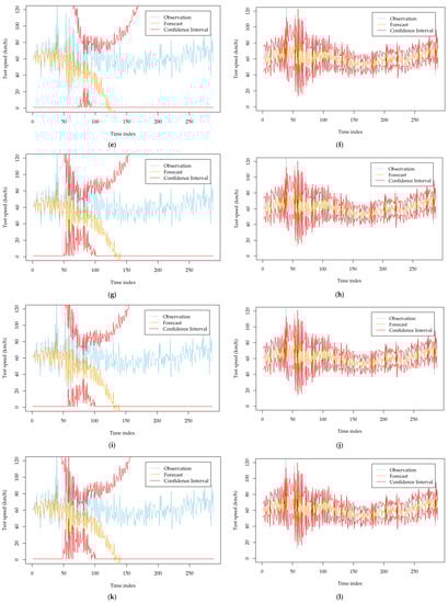Comparison of the volatility forecasting performance of six developed models with different order identification strategies at station MA_1014014 on 9 September 2018; (a) GARCH (automatic order identification); (b) GARCH (manual order identification); (c) TGARCH (automatic order identification); (d) TGARCH (manual order identification); (e) NGARCH (automatic order identification); (f) NGARCH (manual order identification); (g) NAGARCH (automatic order identification); (h) NAGARCH (manual order identification); (i) GJR-GARCH (automatic order identification); (j) GJR-GARCH (manual order identification); (k) FGARCH (automatic order identification); (l) FGARCH (manual order identification).