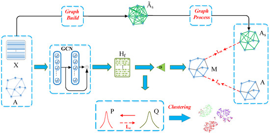 In the early days, graph clustering methods used only structure information for network embedding. Utilizing structure information, some methods [4,5] based on random walk implement representation learning by maximizing the probability of cooccurrence of node pairs. Recently, refs. [6,7,8] suggest mining meaningful features from networks with BDM (Block decomposition method). For example, by BDM, ref. [6] obtain graph motif complexity for network clustering. Removing a minimum subset of edges, ref. [7,8] can obtain the desired clusters with minimum loss of information contribution, which is calculated by algorithmic complexity obtained from BDM. Along with the development of deep models, plenty of deep clustering models have emerged [9,10,11,12,13,14]. However, the conventional deep clustering models focus on investigating Euclidean structure data. For example, data of faces, data of animals, data of vehicles. Unlike Euclidean structure data, the relationships between nodes in the graph have nothing to do with their positions in space. For this reason, the traditional deep models cannot handle both the attribute and structure of graph data properly. Recently, the question of how to exploit both graph structure and node attribute sufficiently has attracted more and more attention in clustering tasks. Graph Convolutional Network (GCN) [2] is a powerful model to meet the need mentioned above. A great number of graph clustering models based on GCN have been developed. Inspired by AutoEncoder, Graph auto-encoder (GAE) [15] implements representation learning in an encoder-decoder mechanism. Following GAE, ARGE [16] improves representation learning by introducing an adversarial training module. MGAE [17] proposes to exploit the interplay between node attribute and structure information. GAT [18] introduces an attention mechanism to specify different weights to different neighbors. Following GAT, ref. [19] aggregates its neighbors by learning an attention mechanism in an unsupervised way. SDCN [20] is a deep model that can alleviate the impact of over-smoothness by fusing embeddings from different modalities. Based on SDCN, DFCN [21] improves performance by integrating global structure information into local structure information.