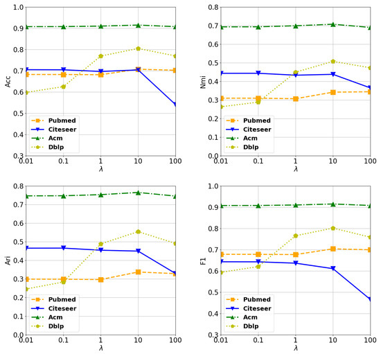 We empirically choose the range of as . In Acm, the fluctuation of the performance is slow and tiny, but it is clear to see that the best performance is achieved when . The best values for in Pubmed and Dblp is 10 too, as we can observe easily in Figure 2. However, the best performance is achieved in Citeseer when . These observations can validate that: (1) The auxiliary graph is helpful for clustering tasks. (2) Compared to Citeseer, the auxiliary graph plays more import roles in Pubmed, Dblp, and Acm. From the degree of improvement, Dblp is benefited most. It achieves an improvement of nearly 20% in Acc from 0.01 to 10. Although achieving improvement, the degree is not as much as Dblp’s. The reason may be that compared to the given graph of Dblp, graphs of the other datasets can cover relationships more completely. Also we can observe that the performance tend to decrease to different degrees for all datasets when varies from 10 to 100. There are two reasons for this: (1) Although filtered, the auxiliary graph still contains noise, and putting too much weight on it will increase the impact of noise. (2) There exists linked pairs in the given graph, they belong to the same cluster, but they are not linked in the auxiliary graph. Putting too much emphasis on the auxiliary graph may ignore this kind of relationship, which leads to a sub-optimal performance. According to the reasons above, we cannot put too much weight on the auxiliary graph during the training.
