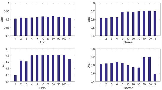 The range of K is . N denotes the number of nodes in dataset. First of all, from the Figure 3 it is not hard to observe that for all datasets the best performances are achieved when . However, when then all the performances decrease to different degrees. There exists too much noise in an unfiltered auxiliary graph that will harm the performance noticeably. First of all, for all datasets, the best choice for K is 100 according to the figure. For Acm, the performance always keeps stable when K varies. Although a little, the auxiliary graph still improves the performance. For Citeseer, Dblp, and Pubmed, the performance can be improved substantially when K reaches or passes a certain thresh. In our experiment, the thresh for Citeseer is 5, 4 for Dblp, 50 for Pubmed. In most cases, the performance increases as the K increases. However, when , the performance become worse than . This is because a full connected graph which is built by raw features contains much more noise than a filtered graph.
