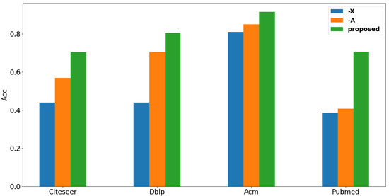 To study how the structure influences our method, we conduct experiments in two different ways: (1) Remove the attribute from the input; (2) remove structure information from the input. The results are shown in Figure 4. From this figure we can easily observe that with the structure only our method can achieve better performance than the performance with features only. We can infer that for these datasets, the structure plays a more critical role than the feature does in our method. And we can easily observe that when we integrate attribute with structure as input, we can achieve the best performance over other methods that are compared in our experiments.