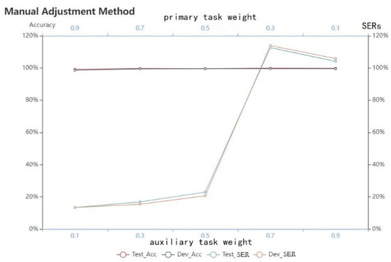 Before using the dynamic adjustment method, we tested the performance of the Soft-MTL Transformer on two tasks of Tibetan multi-dialect by manually using various combinations of task weights. As shown in Figure 5, there is a positive correlation between the performance of the model in each task and their weights. In other words, the greater the task weight, the better the performance of the model in the corresponding task. The primary task is the Tibetan multi-dialect speech recognition task, which has the lowest SER at a task weight of 0.9. Although the auxiliary task is not as sensitive to the task weight as the primary task, its performance also tends to improve with the increase in task weight.