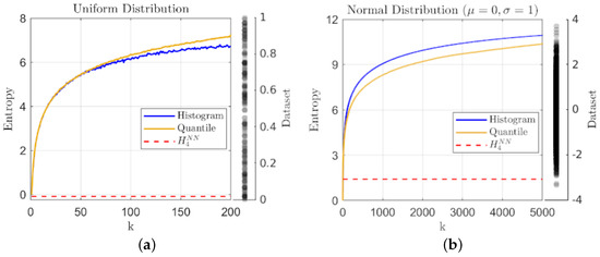 We should also point out that the knn (and m-spacings) estimator is what may be called a local estimator, in that it uses N (or ) distinct, but essentially overlapping macrostates to produce the estimate. This means that no direct association can be made between the number of neighbors k (or m) and the parameters that are used to define either histograms bins or quantiles. As such, we will focus our comparisons between geometric partition entropy and histogram-binning, but will include the value obtained by knn for in each plot for reference.