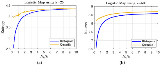Figure 3 shows that the quantile-partition entropy provides a better estimate of the overall entropy with very few data points: in (a) for a small number of states, the histogram requires approximately double the sample size to achieve the same level of utility that (due to interpolation) the quantile partition approach can estimate using a sample less than the number of states; and in (b) we see that for more dense state spaces, the histogram approach only stabilizes after using a sample whose size is approximately four times the number of states.