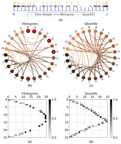 Figure 4, where (a) shows the data set together with the histogram bins and quantile partition that are associated with the choice of