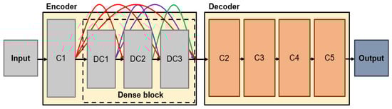 In recent years, deep learning methods are being actively applied in the field of image fusion, and it has been found that deep learning-based image fusion improves the time-consuming efficiency and the fusion effect [18,19]. Prabhakar proposed a CNN-based deep learning model that has a Siamese network architecture, which consists of two CNN layers in the encoder and three CNN layers in the decoder [14]. Each encoder requires two inputs, and the generated feature maps are fused using an addition strategy to obtain the final image at the decoder. Although this fusion method performs excellently well in terms of speed, the network structure is too simple to properly extract salient features. Additionally, there is a problem that useful information in the intermediate layer is lost when using only the result calculated from the last layer in the encoding network. To solve the information loss problem, DenseFuse is employed, which uses a set of convolutional layers with a cascade structure, called dense block, as a CNN model for fusing visible and infrared images [15]. Figure 3 shows the training architecture of DenseFuse. C1, DC1, DC2, DC3, C2, C3, C4, and C5 denote the convolutional block (convolutional layer + activation function). Dense block includes three convolutional blocks, and each block includes convolutional layers with 3 × 3 filter and ReLu activation function. Each layer included in the dense block can extract salient features by preserving deep features in the encoder network as the output is cascaded as the input of the next layer.