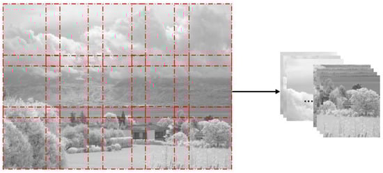 From the visible and NIR image datasets, several 256 × 256 images, which are the input image size of the proposed model training step, are cut out at regular intervals and secured with only the luminance channel. Figure 4 shows a pseudocode of the proposed algorithm. In order to obtain images as many as possible, we acquired images cropped with as little overlap as possible through this pseudocode. Figure 5 shows how an input image is obtained from an image size of 1024 × 679 through the proposed algorithm. In this way, we were able to augment the visible and NIR images from 971 to 9883, respectively. The proposed algorithm is also applied to the previously fused target images to obtain the target images to be trained.