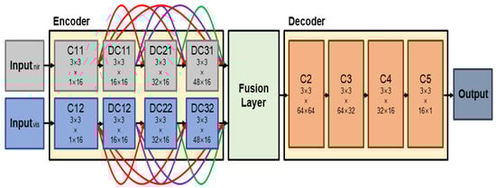 A final image is generated through a total of four convolutional layers in the decoder network. The encoder, fusion layer, and decoder are trained to minimize the loss function by comparing the final image generated to learn the target image with the acquired target image. In Equation (9), the loss function is denoted by . In Equation (10), the pixel loss function is denoted by In Equation (11), the structural similarity (SSIM) loss function is denoted by with the weight [14].