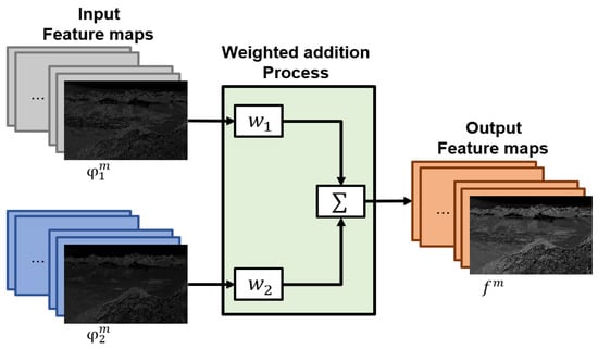 The addition fusion strategy synthesizes the salient feature maps obtained from the encoder through Equation (1). indicates the feature map generated from each input and n indicates the number of inputs; f denotes a feature map in which the feature maps of each input are synthesized. This strategy has a speed advantage by simply adding to combine the outputs of previous layers [14].
