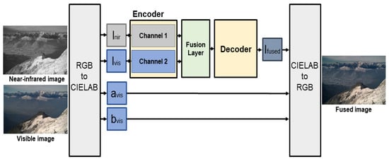 Figure 9 shows the fusion method of the proposed model. First, an image to be fused is divided into luminance channel l and color channels a and b through CIELAB color space conversion. The CIELAB color space is based on the color perception characteristics of human vision, has excellent color separation, and is widely used in image tone mapping models to preserve and compensate color components [24]. The color channel of the visible image is preserved and used as the color channel of the fused image. Separate of the visible and NIR image used as inputs are fed into the input of each channel of the learned encoder network. The feature map output from the output of each channel are fused at the ratio trained from the fusion layer, and the fused feature map enters the input of the decoder network to obtain a fused luminance image . Finally, are merged into , and a color image is obtained through RGB color space conversion.