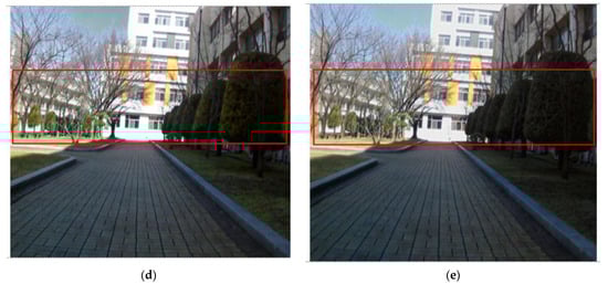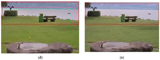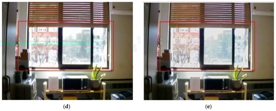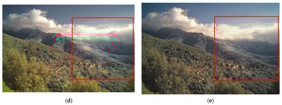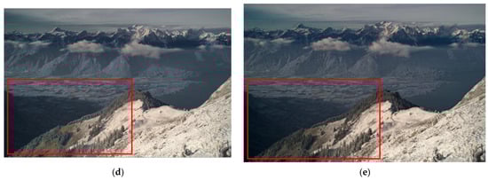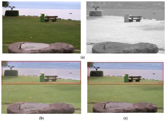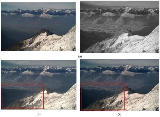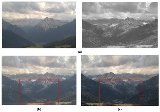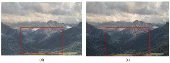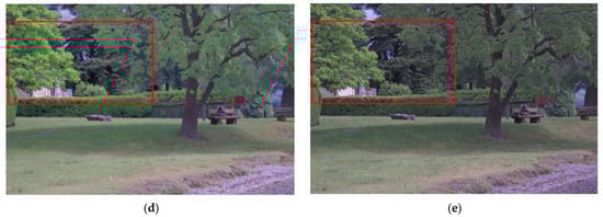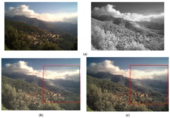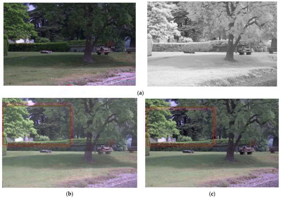 In Figure 13d,e, the boundaries between the trees are clear and the detail of the leaves is superior to Figure 13b,c. The proposed method, Figure 14e and the target image, Figure 14d, have information on distant mountains that are not visible in Figure 14b,c. In addition, the proposed method provides a clearer image even in the details of the grass part. In the case of Figure 15b, the buildings beyond the glass that is concealed in the visible image can be seen clearly, but the detail of the tree part that is detectable in the visible image is inferior. Figure 15c has an overall blurry image. However, in Figure 15e, not only the trees but also the buildings beyond the glass are clear. In Figure 16b,c, the boundary between the tree part and the structure is blurred, so the structure cannot be clearly distinguished. In Figure 16d,e, the boundary is clear and the image quality is excellent, so the structures can be distinguished well.
