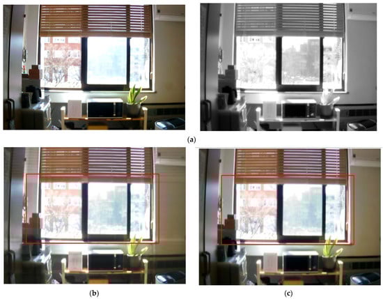 The difference image between the visible and NIR image pairs obtained by the proposed algorithm is obtained using Equation (3). In Equation (4), the visible and infrared images are denoted by and , respectively, and the difference image is denoted as . Using obtained from Equation (3), the luminance average of is obtained using Equation (4). In Equation (4), the average luminance value of is denoted by , and the size of is given by . and represent the row of and column of , respectively. Visible and infrared image selection of above a certain value is performed.