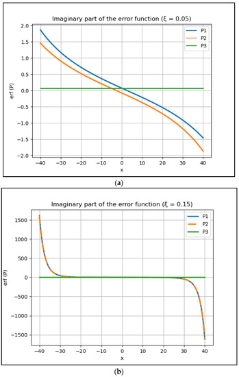 The imaginary part of the error function for P1, P2 and P3 considering two different values of : (a) = 0.05 and (b) = 0.15. The real part of these error functions is close to zero ( ) and, consequently, presents little relevance.