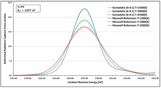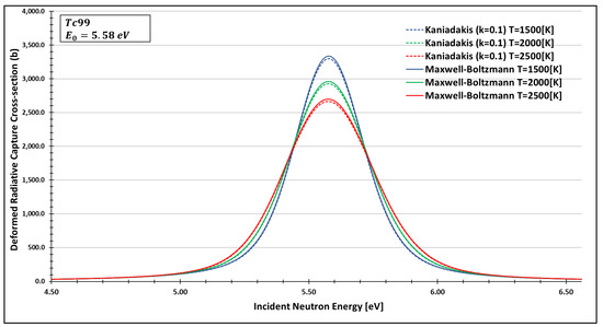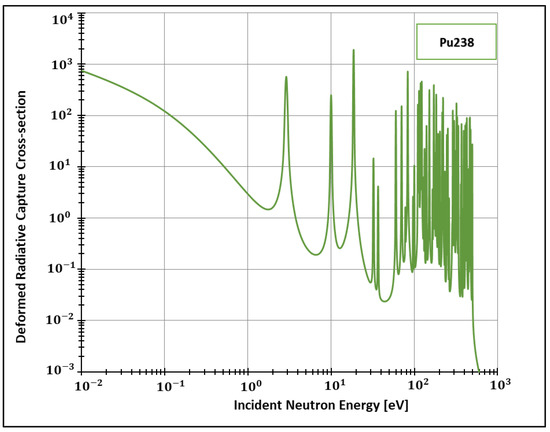After implementing the deformed analytical solution for the Doppler broadening function inside FRENDY’s test module, we were able to generate data for the deformed radiative cross-sections for different elements. Considering the adopted method for calculating these quantities (SLBW), FRENDY’s default package offers the calculation of cross-sections for two important elements: Plutonium 238 and Technetium 99. The former element (Pu238) is of crucial importance, for instance, to space exploration [37] and Mars colonization [38,39]. In addition, 80% of the scans performed in nuclear medicine departments are made from the latter element [40]. Both can be produced in research nuclear reactors, such as the High Flux Isotope Reactor in the United States [41] and the Moly project of the recent Research Reactor Jules Horowitz (JHR), still under construction in France [40].