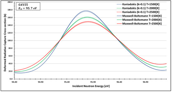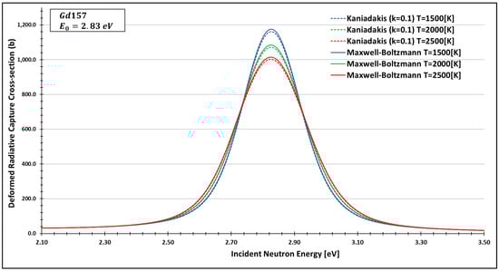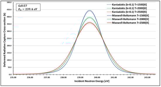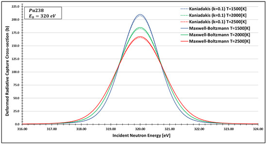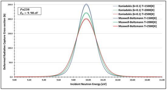 As one can see, the deformed curves presented the expected behavior since there is an attenuation of the resonance curves, especially on the peaks, compared to the standard neutron radiative cross-section using the Maxwell–Boltzmann entropy. In fact, the relative error between the Maxwell–Boltzmann and Kaniadakis peaks is around 1%, which is the same order of magnitude (~1%) obtained in previous works for the calculations of deformed Doppler broadening functions using the Kaniadakis entropy.