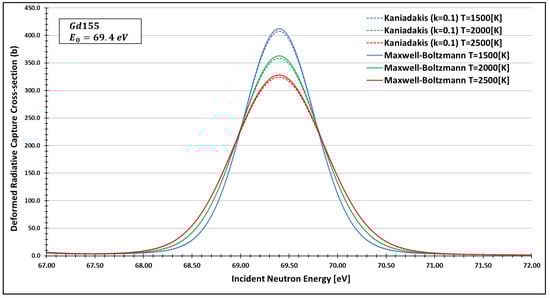 is a deviation parameter that measures the deviation concerning the Maxwell–Boltzmann distribution [1,12], is the Boltzmann constant, is the resonant energy, E is the energy of the incident neutron, A is the mass number, and Γ is the total width of the resonance as measured in the laboratory coordinates. Furthermore,