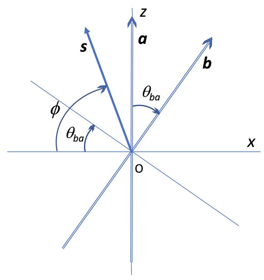 In line with the probabilistic description discussed above, we consider an ensemble of realizations. Assume we want to determine the sign of b, given a certain value fora, say . This means that all the elements of the ensemble considered, if actually measured (projected) along , would give the result . We are assuming all relevant vectors to lie on the plane, for simplicity, taking into account that our probability density depends on one variable only. The direction may be aligned with the axis, and is then contained in the xz plane, forming an angle with the z axis.