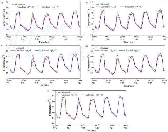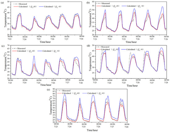 Two predicted values and measured value of the PTH’s exterior-surface temperature in summer: (a) south; (b) west; (c) east; (d) north; (e) roof.