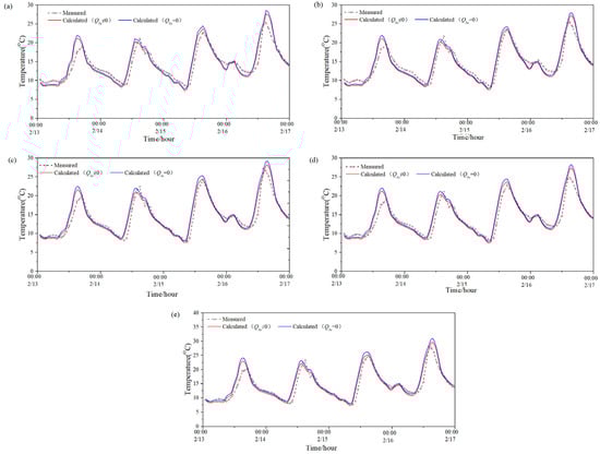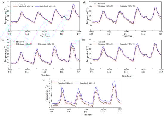 Two predicted values and measured value of the PTH’s exterior-surface temperature in winter: (a) south; (b) west; (c) east; (d) north; (e) roof.