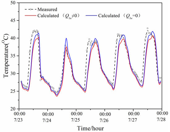 Figure 3 shows the model-predicted temperature value with and without considering the long-wave radiation and measured temperature value of five exterior surfaces (south, west, east, north and roof) of the PTH during a summer (0:00 of 23 July–0:00 of 28 July). Table 4 displays the average difference between the two predicted values of each exterior surface during the same period, the maximum difference between the two predicted values of each exterior surface at night, and the maximum difference between each exterior surface in the daytime during the same period. It can be seen that the average difference between the two predicted values of the roof were larger than those of the other surfaces, that is to say, the long-wave radiation had the most obvious influence on the predicted exterior-surface temperature of the roof. The average difference between the two predicted values of the remaining surfaces was not obvious, in comparison, and the average difference of the two predicted values on the northern surface was the least. Moreover, for all exterior surfaces, the maximum difference between the two predicted values in the daytime was larger than that at night during the period; therefore, the influence of long-wave radiation on the predicted value of the exterior-surface temperature in the daytime was greater than that at night in summer.
