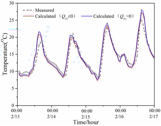 - In both summer and winter, the predicted temperature values of the model when considering long-wave radiation were closer to the experimental results than those of the model ignoring long-wave radiation.