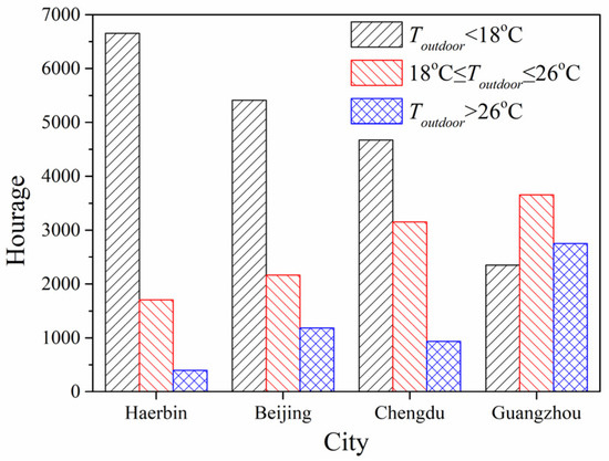 Referring to the data of China Meteorological Data Service Centre [32], basic climate conditions of the four cities are presented in Figure 9 and Figure 10. Figure 9 depicts the hours of outdoor air temperature distribution for the four cities throughout the year. The cities with a number of hours with an outdoor air temperature less than 18 °C in descending order were: Harbin > Beijing > Chengdu > Guangzhou. The cities with a number of hours with an outdoor air temperature greater than 26 °C in descending order were: Guangzhou > Beijing > Chengdu > Harbin. The number of hours greater than 26 °C in summer in Chengdu was less than that in Beijing.