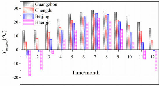 Figure 10 depicts the monthly mean outdoor temperature over time in the four cities. It can be seen that Guangzhou had the smallest monthly mean outdoor temperature difference between summer and winter, while Harbin had the largest monthly mean outdoor temperature difference between summer and winter. In summer, the maximum value of the monthly mean outdoor temperature occurred in Guangzhou, while the minimum value occurred in Harbin. In winter, the monthly average outdoor temperature in Guangzhou was higher than that in the other three cities, and Harbin had the lowest monthly average outdoor temperature. The order of the monthly mean outdoor temperatures in the four cities from largest to smallest was: Guangzhou > Chengdu > Beijing > Harbin.