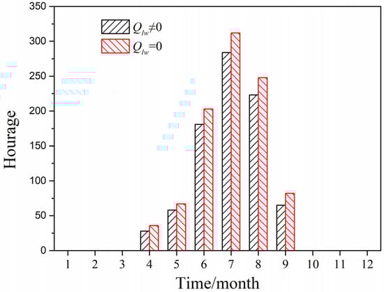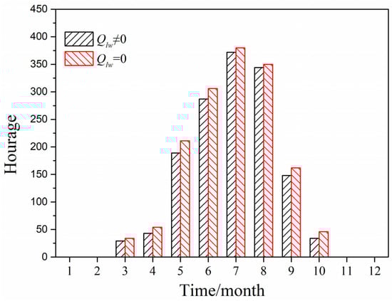 Figure 11 depicts the cumulative annual hours of greenhouse effect by using the predicted model with and without considering long-wave radiation in Harbin City located in the severe cold region, when it was under solar radiation and the indoor temperature was greater than the outdoor air temperature (outdoor air temperature greater than 26 °C). It can be seen that the cumulative number of annual greenhouse effect hours when ignoring long-wave radiation was 942 h, while the cumulative number of annual greenhouse effect hours when considering long-wave radiation was 839 h. When the long-wave radiation was ignored, the external heat dissipation of the PTH through the exterior surface was ignored, and the calculated value of the indoor temperature was larger, so the number of cumulative hours of greenhouse effect was larger.