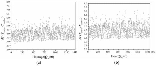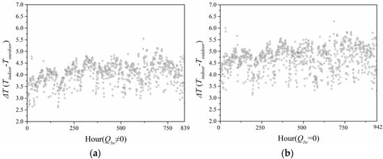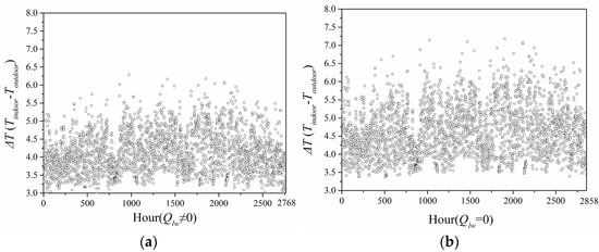 Figure 13 displays the cumulative annual hours of greenhouse effect by using the predicted model with and without considering long-wave radiation in Beijing City located in the cold region, when it was also under solar radiation and the indoor temperature was greater than the outdoor air temperature (outdoor air temperature greater than 26 °C). It can be seen that the cumulative number of annual greenhouse effect hours when ignoring long-wave radiation was 1536 h, while the cumulative number of annual greenhouse effect hours when considering long-wave radiation was 1628 h, that is to say, the cumulative number of hours of greenhouse effect when considering long-wave radiation was smaller than that when ignoring long-wave radiation.