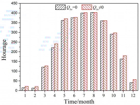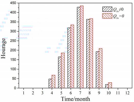 Figure 17 illustrates the cumulative number of annual hours of greenhouse effect by using the predicted model with and without considering long-wave radiation in Guangzhou City, a city with a hot summer and warm winter. It can be seen that during the daytime from April to October, the number of hours of greenhouse effect of the PTH exceeded 200 h; during the daytime of July and August, the number of hours of greenhouse effect of the PTH reached 400 h. The greenhouse effect basically appeared in the daytime of summer. The cumulative number of annual greenhouse effect hours when considering long-wave radiation was 2768 h, while the cumulative number of annual greenhouse effect hours when ignoring long-wave radiation was 2858 h, so the cumulative number of hours when considering long-wave radiation was smaller than the cumulative number of hours when ignoring long-wave radiation.