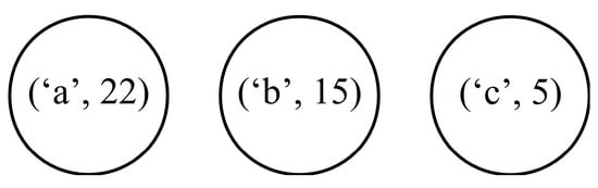 where  for  describe the probabilities of the occurrence of the individual symbols from the alphabet . In our example, these probabilities can be calculated as , with  describing the frequencies of the occurrence of the symbols (these frequencies are in the second column of Table 1). Hence, for the symbol ‘a’ we have , for the symbols ‘b’ and ‘c’ we have  and , respectively. Based on these results, one can easily calculate the entropy using the formula (1), which leads to the result of  bits per symbol.