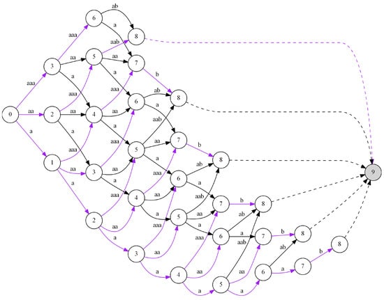 In Figure 5, we can see the multistage graph created for the exemplary input data . We start to solve the problem of finding the optimal code with node 0 and stage . It is obvious that the distance from node 0 to itself equals 0 (i.e., ). It should be noted that in our example, we assumed , which results in the possible values  of the states reachable for the next stage  (i.e., ). Moving from node 0 at stage  to nodes  at stage  corresponds to coding the following sequences of symbols  with the use of the codewords , respectively. It gives the lengths  of the paths leading from the starting node 0 to nodes  at stage . They are automatically the shortest paths from the starting node to the nodes considered at this stage (i.e., we have , , and ). In the next step, we move to stage . With  and having the nodes  at the stage , we can move from node 1 to nodes , from node 2 to nodes , and from node 3 to  (this means ). It corresponds to coding the following sequences of symbols taken from the input data: (i) moving from 1 to  means , (ii) moving from 2 to  takes , and (iii) moving from 3 to  corresponds to . All these sequences  can be coded using the following codewords  with lengths . Finding the shortest path for node 2 at stage  is trivial because we have only one path from the nodes at stage  to that node. It corresponds to the sequence ‘a’ from node 1 and codeword 111. Because the length of the shortest path for node 1 at stage  is 3, we can say that the shortest length of the searched-for path is 6 (i.e., ). In the case of node 3, it is more complicated because it can be reached from two nodes  at stage  with sequences  and codewords . It should be noted that the lengths of the shortest paths to nodes  at stage  equal 3 and 2, respectively. Hence, in order to find the shortest path leading from the starting node to node 3 at stage , we have to choose the smaller value from the sums  and  (which corresponds to ). Both sums are equal so we choose the first possibility, which means the path moves from 0 to 1 and then to 3. We have to solve the problem of finding the shortest paths for the remaining nodes and the subsequent stages in the same way. It should be noted that the shortest paths for each node at every stage are indicated with by purple in the graph in Figure 5. In the case of node 8 (the final node), we have several shortest paths found because this node can be reached from several stages, which gives several candidates for the optimal path. Hence, the final solution to the problem is the shortest path selected among them, which in the graph is indicated by the additional node 9.