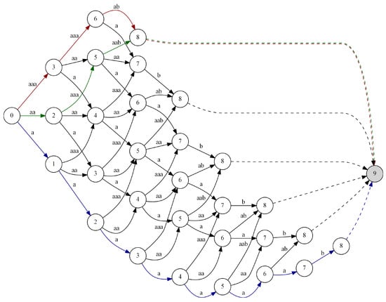 The proposed algorithm allows us to find the optimal code  for a given sequence of input data  (see Algorithm 2). It consists in building a directed graph stage by stage, which describes all possible ways of coding input data. See Figure 5 for an illustration in which each column represents a stage. By stages, we mean the subsequent steps of the algorithm leading to finding the optimal solution, while states can be interpreted as positions (indexes of symbols) in the sequence of input data. The nodes of the graph are labeled with the numbers , and they represent all possible states of the process at the following stages. In fact, the nodes with the same number n correspond to one state n. Examining the graph, looking for a path leading from node 0 to node n is equivalent to analyzing the input data from the first symbol (state 0) to the end of the entire sequence (state n). Depending on stage e, where , the set  of possible states that we can proceed to in our next step is defined as: