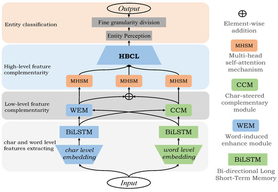 The structure of the HBCL. When high-level feature complementation generates a new word-level embedded feature vector and character-level embedded feature vector, feature complementation is performed twice, which greatly improves the acquisition of effective features and reduces the proportion of useless features.