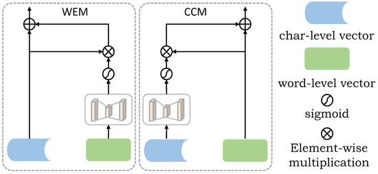 The structures of the WEM and CCM. WEM(CCM) obtains a new word (character)-level embedded feature vector after low-level feature complementation. The character (word)-level embedded feature vector obtains the feature weight through the activation function, and then the weight is multiplied with the character (word)-level embedded feature vector to extract the useful feature of the character (word)-level embedded. Finally, the new word (character)-level embedded feature vector is obtained through residual connection.