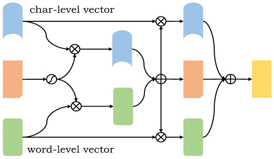 A fused vector is the fusion of word-level embedded feature vector and a character-level embedded feature vector. It is connected by vectors and recorded as . Then, the weight H of the feature is obtained through the activation function. The word-level feature vector and the character-level feature vector are respectively multiplied by the weight to obtain a new feature vector. At this time, high-level feature complementation is carried out. The whole process is shown in formulas (17)–(19).