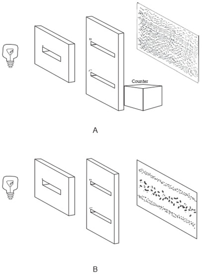 Two setups of the double-slit experiment are considered, in each of which a sufficient number (about 70,000 are required to observe interference effects) of photons emitted from a source are allowed to pass through the slits and collide with the screen. In the first setup, A (Figure 1), we can, at least in principle, know through which slit each particle passes; in the second setup, with both slits open, we do not and, more significantly, in principle, cannot know this. This is an important qualification, which plays a key role in several more subtle versions of the double-slit experiment, such as the “quantum eraser” experiment [26]. (The type of “knowledge” may also be considered as the ability to predict which slit could, in principle, be passed through (assuming no faster-than-light influences) based on particle state preparation alone [27].) We can have this knowledge by installing devices, such as counters, which allow us to do so without appreciably disturbing the course of each individual run of the experiment (defined by an individual emission from the source or passing it through the slit in the first, single-slit diaphragm, installed before the one with two slits) in this setup. Such devices are sometimes called the “which-path” or “which-way” devices, terms based on a classical concept, ultimately inapplicable to “what actually happens”, whose expression, as discussed earlier, is not applicable either, at least in RWR-type interpretations. One can also close one of the slits for each such run, which allows each object only to go through one slit. A given quantum object could be blocked by the diaphragm, but these runs of the experiment are discounted. There are experiments, as discussed below, that allow us to “channel” each particle in a more controlled way in each individual run of the experiment, keeping in mind that, while the term (noun) channel applies to the experimental arrangement, one cannot, in the RWR view, speak of a particle passing through a channel. In this setup, quantum objects behave in a particle-like manner both individually and collectively: that is, as just explained, the observed random pattern of collisions is similar to that which would appear if we conducted an analogous experiment with classical objects, idealized as particles. The interference pattern, which occurs in the second setup, never appears. As noted, merely setting up the apparatus in a way that such knowledge could, in principle, be possible, even if not actually obtained, would suffice.