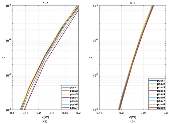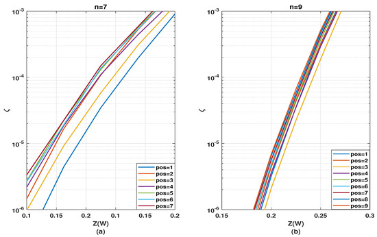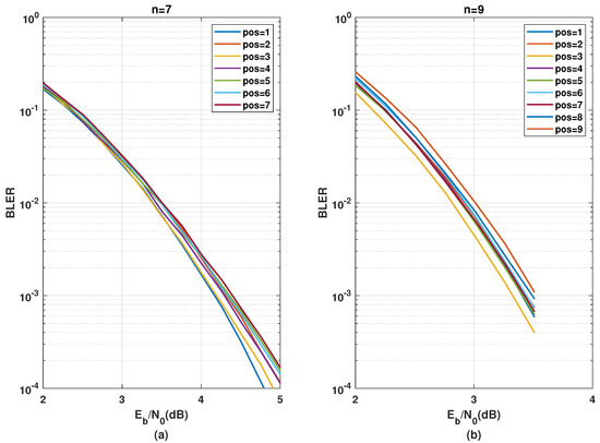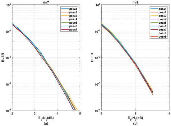 A general observation is that performance optimality based on kernel position gets gradually less relevant with the increasing number of stages. This pattern is as expected since, with an increasing number of stages, the polarization effect from one specific stage gets diluted and becomes less significant within the overall polarization circuit. Therefore, it is more important to optimize the kernel order for a smaller number of stages, i.e., small finite codeword lengths. Additionally,