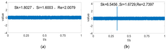 Noise signal, sporadic impulse + noise signal, cosine signal + noise signal, and periodic impulse + noise signal (Figure 3) are defined to analyze , , and . Since Gaussian noise signals are stable for the same higher-order statistics, the normalized sensitivity is defined to explain the sensitivity of the aforementioned indicators to typical signals.