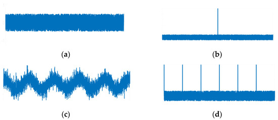 Typical signal of (a) noise condition, (b) occasional pulse with noise, (c) harmonic signal with noise, and (d) periodic pulse with noise.