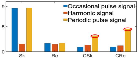 It is clear from Figure 4 that has high sensitivity to both sporadic and periodic impulse signals and is easily affected by sporadic noise. [20] and have good robustness to both harmonic and sporadic impulse signals, and they are highly sensitive to periodic impulse signals, which can thus distinguish the periodic impulse signals. A horizontal comparison reveals that has better sensitivity to under the periodic impulse condition.