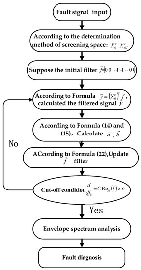 Given the structural peculiarity of the rotating machinery and bearings, the bearing signals are generated essentially by some periodic or cyclic mechanisms, so the dynamic response of bearings has cyclostationary features, and their fault signals exhibit typical repetitive transient characteristics [18]. Deconvolution is effective at eliminating the influence of complex transfer paths and enhancing the impact vibration characteristics of periodic faults. At its core, this method designs a finite impulse-response (FIR) filter with the aim of maximizing the value of the post-filtering signal sensitive characteristic index. For example, the minimum entropy deconvolution (MED) proposed by Wiggins [19], which finds the optimal filter based on the filtering result Sk, enables the iterative extraction of the impact signals from the test signals with unknown transfer paths. With advantages such as requiring less parameter adjustment and possessing fast convergence, MED has been widely applied in the field of mechanical fault-diagnosis [20,21]. However, since MED aims at Sk maximization in the iterative process, the iterations are more inclined to extract unit-impulse signals with larger values, which often fall into the local optimal solution. In 1984, Cabrelli [22] proposed the optimal minimum entropy deconvolution (OMED) and proved that it was an accurate global optimal solution. To improve the sensitivity of the MED technique to periodic impulse signals, McDonald [23] proposed the maximum correlated kurtosis deconvolution (MCKD) in 2012, with which the problem of periodic impulse deconvolution is solved. On the downside, MCKD requires the presence of priori knowledge about the fault cycle, which easily falls into the local optimal solution and is susceptible to strong noise interference. Later, McDonald put forward the multipoint optimal minimum entropy deconvolution adjusut (MOMEDA) in 2017, which eliminated the discontinuity problem between input signals and addressed some problems with OMED and MCKD, achieving preferable effects. However, all of the aforementioned deconvolution methods are considered for single-fault conditions, which are ineffective in the case of impulse signals with different periods caused by composite faults.