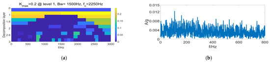 Fast spectral kurtosis results of (a) fast kurtosis, and (b) fast spectral kurtosis envelope spectrum.